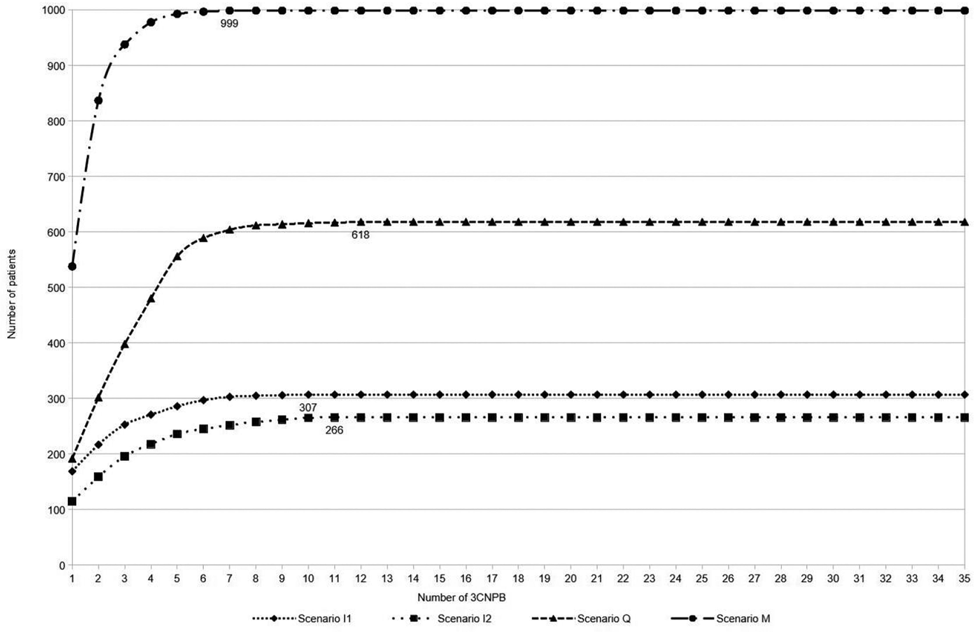 The numbers under the graphic lines showed the maximum number of patients covered in each scenario and the position of the number indicated the number of the 3CNPB where this maximum was achieved.