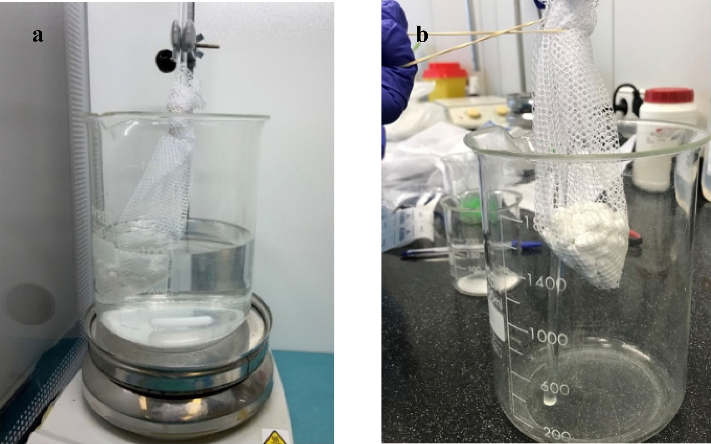 a) Observación del farmacobezoar de 5 x 6 cm formado a las 24 h después de iniciar la inmersión, b) intento de romper el farmacobezoar con un palillo de cristal (b).