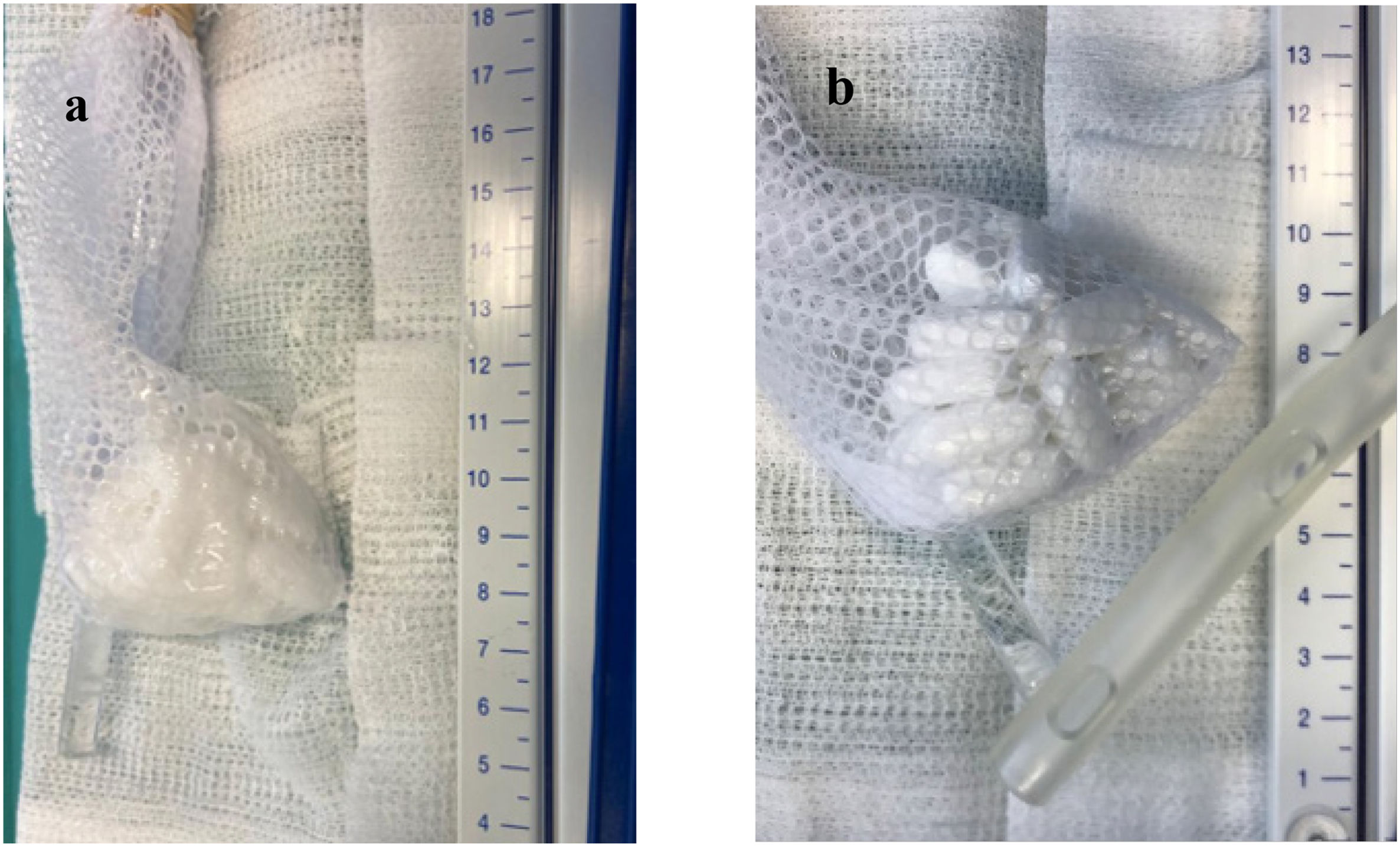 Examen visual de la formación de un farmacobezoar compuesto por 47 comprimidos LP de 500 mg de divalproato sódico. a) Todos se congregaron en una sola bolsa tras una incubación de 2 horas en un fluido gástrico simulado y b) comparación con un tubo de lavado orogástrico 30F.