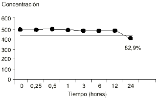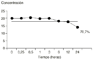 Se ha fijado como criterio de estabilidad que la muestra mantuviera más del 90% de riqueza de la concentración inicial. Los resultados muestran que la mezcla es estable a temperatura ambiente hasta seis horas después de la preparación.