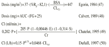 | Carboplatino | El Cl se correlaciona con la FG El Cl se correlaciona con la SC. | Madden, T (1992) (30) Newell, DR (1993) (40) |