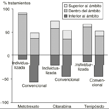 La monitorización de las concentraciones plasmáticas de los antineoplásicos como estrategia de individualización de su dosis es, desafortunadamente, mínima en la mayoría de los hospitales, a pesar de estar bien definida su indicación. En efecto, las premisas para la monitorización de forma rutinaria de las concentraciones plasmáticas de los agentes antineoplásicos han sido estructuradas por Grochow en 1998 (tabla 5) (2). Actualmente estas premisas se encuentran validadas para el 5FU, metotrexato a altas dosis (HDMTX), etopósido, tenipósido, citarabina, busulfán y carboplatino, ya que su aplicación en clínica ha presentado resultados prometedores (17). Un ejemplo claro de esta situación son los resultados de la monitorización de las concentraciones plasmáticas de metotrexato, tenipósido y citarabina para su individualización posológica en pacientes pediátricos diagnosticados de leucemia aguda linfoide (Fig. 3) (18). La monitorización garantiza un mayor porcentaje de ciclos con concentraciones plasmáticas dentro de los ámbitos terapéuticos definidos que cuando el tratamiento se aplica utilizando los criterios tradicionales y las dosis estándar.