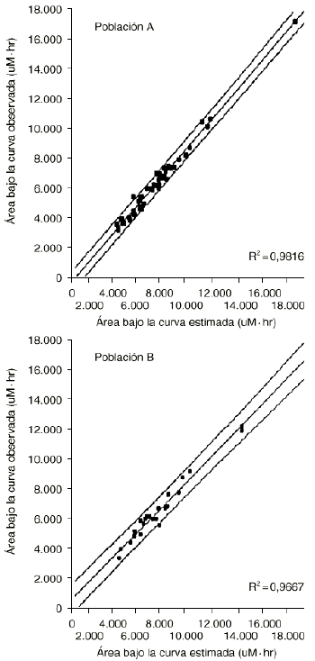 Figura 4.--Área bajo la curva calculada a partir de los parámetros farmacocinéticos (AUC observada) y área bajo la curva calculada a partir del modelo de estimación del AUC a partir de un número de muestras limitada (AUC estimada) en las poblaciones A y B (en ambos casos se han dibujado las líneas de regresión y sus IC95% asociados a las predicciones individuales). Tomada de Peris et al (22).