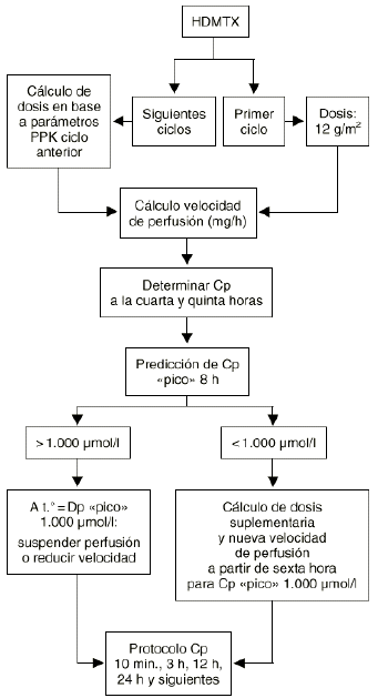 Una posible estrategia para abordar este problema consiste en la administración de una dosis previa seguida de la monitorización intensiva de las concentraciones plasmáticas del fármaco con el objetivo de caracterizar los parámetros farmacocinéticos del paciente de forma individual y predecir la dosis a administrar posteriormente. Este método ha sido ampliamente utilizado en la individualización del metotrexato a altas dosis (26).