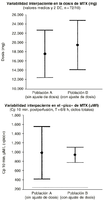 Figura 6.--Influencia del método de ajuste posológico (gm/m2 versus concentración diana >= 1.000 µmoles/litro) de metotrexato a altas dosis sobre la variabilidad en la dosis (g/m2) y en la concentración (µmoles/ml) interciclo.