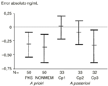 Por otra parte, el 5-fluorouracilo es un fármaco cuya variabilidad intraindividual es menor que la variabilidad interindividual. El modelo bayesiano desarrollado para predecir el comportamiento cinético individual del 5-Fu, utilizando las concentraciones plasmáticas obtenidas durante el primer ciclo de tratamiento (10), evidencia que únicamente el conocimiento de la concentración plasmática de los diez minutos postperfusión (Cp1) mejora la exactitud (expresada como error absoluto) del modelo, de forma estadísticamente significativa, con respecto a las predicciones realizadas a priori y a posteriori (10) (Fig. 7). Por tanto, disponer de las muestras a los treinta y sesenta minutos postperfusión (Cp2 y Cp3), conjuntamente a la concentración plasmática a los diez minutos (Cp1) de finalizada la perfusión, no ofrece ventajas para la individualización posológica de ciclos sucesivos por cuanto que no mejora la información proporcionada por el modelo a priori desarrollado tanto con el programa PKS como con NONMEM. Esta metodología ha sido validada para otros citostáticos como son el etopósido (29), el carboplatino (50) y el cisplatino (54), entre otros.