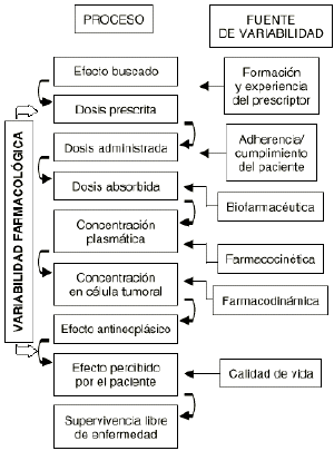 Una característica principal del tratamiento farmacológico antineoplásico es la variabilidad en la respuesta clínica deseada. Las razones o determinantes de esta variabilidad se han tratado de fundamentar en los complejos procesos intracelulares y en los mecanismos de acción y de resistencia de los citostáticos, por lo que la potencial relación de la dosis con la respuesta todavía se sigue utilizando como criterio para predecir la respuesta en el paciente oncológico (2, 3). Sin embargo, el concepto probabilístico de dosis-respuesta se encuentra prácticamente superado en base a que la variabilidad en los procesos que acontecen, desde la prescripción del tratamiento hasta la respuesta en el paciente, es multifactorial y no sólo explicable por la dosis (Fig. 1).
