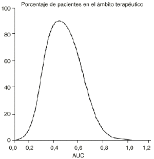 Figura 2.--Porcentaje de pacientes en el ámbito terapéutico en función del área bajo la curva concentración-tiempo (AUC).