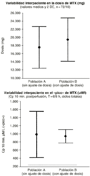 Además esta aproximación puede ser utilizada tanto cuando la variabilidad en los parámetros farmacocinéticos de un individuo, entre los distintos ciclos de quimioterapia que recibe, iguala o supera la variabilidad interindividual como cuando la variabilidad intraindividual sea menor que la variabilidad interindividual. El metotrexato es un fármaco de estrecho ámbito terapéutico y amplia variabilidad intraindividual (superior a la variabilidad interindividual) que exige la monitorización de sus concentraciones plasmáticas y el establecimiento de un conjunto de acciones dirigidas a prevenir su grave toxicidad potencial sin interferir en su actividad antitumoral en cada ciclo que recibe el paciente. A pesar de ello no menos del 20% de los ciclos, con dosis altas de metotrexato, se manifiestan de alto riesgo. En el tratamiento neoadyuvante del osteosarcoma con metotrexato los resultados clínicos obtenidos prueban cómo la supervivencia libre de enfermedad se incrementa a medida que los pacientes reciben mayor intensidad de dosis de metotrexato (28). Esta información es consistente con la necesidad de monitorizar las concentraciones plasmáticas a fin de individualizar las dosis de metotrexato a administrar al paciente en cada ciclo para conseguir concentraciones plasmáticas pico del orden de 1.000 µM (Fig. 5). Este criterio posológico, soportado por la metodología bayesiana, ha supuesto el abandono del peso y/o la superficie corporal del paciente como variables para determinar la dosis individualizada de metotrexato en nuestro hospital. En la práctica la aplicación de este criterio representa trasladar la mayor parte de la variabilidad intraindividual en la concentración pico a la dosis administrada en los pacientes (Fig. 6).