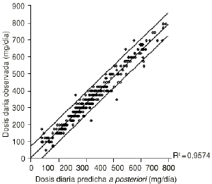 La exactitud y la precisión en la estimación de la dosis diaria a administrar se evaluó mediante la teoría de errores de predicción de Sheiner y Beal (20). Como parámetro de exactitud se calculó la media del error de predicción relativo (ERM) existente entre las dosis diarias administradas y las dosis diarias estimadas mediante la metodología bayesiana (ecuación 6). Como parámetro de precisión se calculó la desviación estándar del error de predicción (DEER) mediante la ecuación 7: