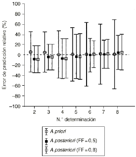En la población B, las dosis de CsA predichas por el modelo 2 se han calculado a priori utilizando el valor medio de los parámetros farmacocinéticos poblacionales, y a posteriori, mediante la tecnología bayesiana, considerando los valores de FF de 0,5 y 0,7. En este último caso para la estimación de los parámetros farmacocinéticos individuales se ha considerado la información disponible del paciente tras cada monitorización de su concentración sanguínea. En la figura 2 se muestra el ERM y su intervalo de confianza del 95% (ERM ± 1,96 DEER) para la predicción a priori y a posteriori para los dos valores de FF analizados en este estudio. La figura evidencia la excelente exactitud tanto de la predicción a priori como de la predicción a posteriori ya que en cualquier monitorización el ERM no es significativamente distinto de 0. En cuanto a la precisión, se pone de manifiesto la progresiva disminución del intervalo de confianza del 95% de ERM de las predicciones a posteriori a medida que se dispone de mayor número de concentraciones sanguíneas de CsA de los pacientes. Todo lo contrario sucede en el caso de las predicciones a priori, donde el intervalo de confianza del 95% de ERM se incrementa a medida que aumenta el número de concentraciones sanguíneas de CsA como era de esperar.