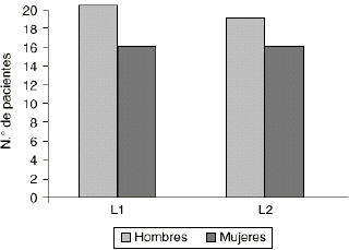 Figura 1.--Distribución, según el sexo, de los dos grupos de pacientes (*2 = 0,11 ns).