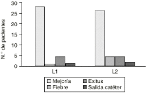 El análisis univariante efectuado entre los valores iniciales y los obtenidos después de la primera semana de tratamiento han mostrado que los pacientes tratados con L1 mostraban un aumento significativo en los niveles de alanin-aminotransferasa, fosfatasas alcalinas y gamma-glutamil transferasa (p = 0,013, p = 0,006 y p = 0,001), mientras que los tratados con L2 mostraban únicamente un aumento significativo de gamma-glutamil transferasa (p = 0,041).