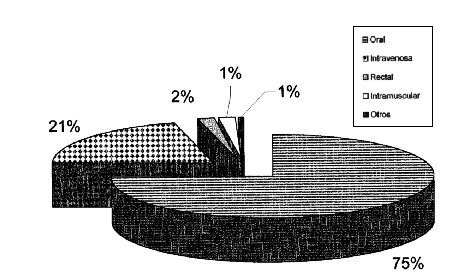En cuanto a lasrutas de administración pautadas en este estudio, se observaun 1,49% de vías incorrectas debido al empleo de lavía intramuscular, ruta de administración noaconsejada por las desventajas de las fluctuaciones en laabsorción y del retraso en treinta-sesenta minutos deltiempo necesario para obtener el efecto máximo(26).