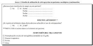 Los pacientesque recibieron EPO para la corrección de la anemia inducidapor quimioterapia tenían una edad mediana de sesenta y cincoaños (veintitrés-ochenta y siete) y eran tratadosfundamentalmente por servicios de oncología (82%). Losniveles de partida de hemoglobina fueron de 9,02 + 1,00g/dl).