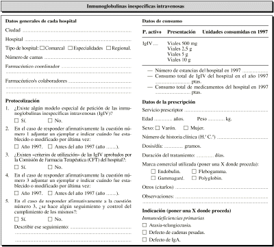Se realizó un estudio transversal de indicación-prescripción de IgIV de un mes de duración (1 al 31 de marzo de 1998). Se incluyeron todos los tratamientos con IgIV prescritos en los hospitales participantes tan-to en pacientes hospitalizados como de hospital de día. Los tratamientos que a fecha 1 de marzo ya habían comenzado se incluyeron, haciéndoles un seguimiento retrospectivo para completar los datos necesarios; de la misma forma, a los tratamientos que el día 31 no habían finalizados se les hizo un seguimiento hasta su conclusión.