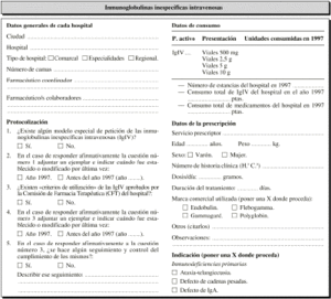 Se elaboró un impreso de recogida de datos de los tramientos, así como de características generales del hospital y consumo de IgIV (Anexo 1):