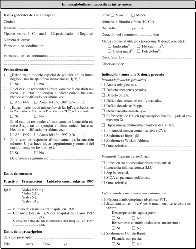 Estudio de utilización de medicamentos, cuanti y cualitativo, tipo transversal, de un mes de duración (del 1 al 31 de marzo de 1998). Se incluyeron todos los tratamientos con IgIV prescritos en los hospitales participantes. Los tratamientos que a fecha 1 de marzo ya hubiesen comenzado también fueron incluidos, haciéndoles un estudio retrospectivo para cumplimentar el cuestionario; de igual manera, los tratamientos que a fecha de 31 de marzo no hubiesen finalizado fueron seguidos hasta su conclusión.