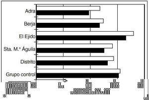 Los valores globales de prescripción obtenidos en nuestro distrito fueron de 26,9 DDD/1.000 habitantes y día, superiores a los del INSALUD en 1993 (6) (18,32 DDD/1.000 habitantes y día), al de la provincia de Zaragoza (18) (17,7 DDD/1.000 habitantes y día), al del Distrito Bahía-Vejer de Cádiz (19) (13,3 DDD/1.000 habitantes y día) o al del Area Costa de Poniente de Barcelona (20) (17,05 DDD/1.000 habitantes y día).
