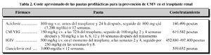 El costeaproximado de los tratamientos profilácticos de CMV se puedever en la tabla 2. Hay que tener encuenta que ningún régimen ha mostrado ser máseficaz comparado con los demás, pero también que elcoste de adquisición es una pequeña parte del costeglobal.
