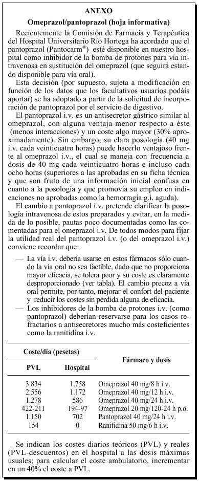 Actualmente,doce meses después de la intervención, lapráctica totalidad de la prescripción siguemanteniéndose en la dosis autorizada (40 mg/24 horas). Enlos casos excepcionales en que se han prescrito dosis mayores y nose ha aceptado adecuarlas a la dosis aprobada se suministraomeprazol i.v. (para evitar que se adquiera la costumbre deutilizar dosis altas del pantoprazol i.v.).