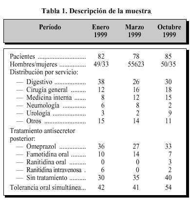 Lascaracterísticas de los pacientes incluidos en los tresperíodos aparecen en la tabla1. No se aprecian diferencias relevantes en el númerode pacientes tratados, en la distribución por sexo oservicio, en el número de pacientes que recibíanotros fármacos por vía oral, ni en tratamientoantisecretor posterior.