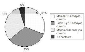 Más de la mitad de los centros a los que pertenecen los farmacéuticos de hospital tienen una media de al menos seis ensayos clínicos al año, destacando en el extremo superior los que realizan en este período hasta 60 y 70 ensayos clínicos (figura 1).