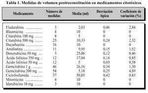 Los resultadosobtenidos en el estudio sobre la variación devolúmenes que experimentan algunos medicamentoscitotóxicos al ser reconstiuidos se detallan en la tabla 1 y fueron los siguientes: