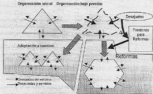 El elemento desencadenantede cambios profundos o reformas en los sistemas sanitarios son losdesajustes existentes entre las estructuras organizativas de losmismos y las demandas del entorno. El dibujo esquemático dela figura 1 trata de recogergráficamente esta idea.