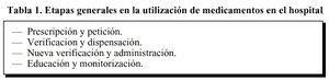 Con las consideracionesprevias, si centramos nuestra atención en el sistema deutilización de medicamentos en los hospitales, que puedeconsiderarse dividido en cuatro etapas generales (tabla 1), observaremos que éstasconstituyen en sí las marcas de contraste de un sistemadiseñado para prevenir errores y reflejan el reconocimientode los hospitales de que la utilización de lamedicación es una empresa compleja que requiere másexperiencia y conocimientos que los que se podría esperar deun solo profesional.