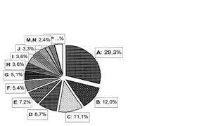 Figura 7.--Causas últimas o esenciales: sistemasimperfectos y deficientes. A: Sistema de difusión deinformación sobre medicamentos. B: Revisión de laidentidad de medicamentos y dosis. C: Revisión de lainformación sobre el paciente. D: Transcripciónmanual de la orden médica. E: Revisión de lasalergias. F: Revisión de la cumplimentación de lasórdenes. G: Comunicación entre el personal del equiposanitario. H: Falta de estandarización (FE): equipamientos.I: FE: dosis y frecuencias. J: FE: distribución demedicamentos en las unidades. K: FE: procedimientos yalmacenamiento en las unidades. L: Preparación demedicamentos intravenosos por enfermería. M:Administración cuando sale o traslada de la unidad (1,2%).N: Resolver discrepancias entre los profesionales sanitarios(1,2%). O: Dotación de personal y asignación detareas. P: Comunicación: «feedback» deacontecimientos adversos por medicamentos (AA). (Fuente: Modificadode referencia 11.)