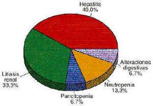 La figura 1 recoge las RAMs causantes de dichos ingresos: dos casos de neutropenia, seis de hepatitis tóxica, cinco de litiasis renal, un caso de pancitopenia y un caso de alteraciones digestivas importantes.