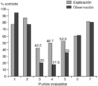 Figura 3.--Comparación de las proporciones de pacientes que realizan correctamente cada uno de los puntos evaluados según la explicación del paciente y la observación por el farmacéutico (n = 40). Al comparar la descripción de la técnica por parte del paciente y la observación de la realización de la misma por el farmacéutico se observaron diferencias significativas en todos los puntos considerados excepto en el punto de la posición del paciente durante la inhalación. 1: posición del paciente. 2: manipulación del inhalador. 3: preparación previa a la inhalación. 4: momento pulsación del inhalador. 5: apnea tras la inhalación. 6: administración de otra dosis. 7: orden de utilización.